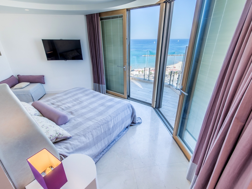 On the 7th floor lays a huge muster bedroom with attached bathroom and an exit to a big balcony with open sea view.