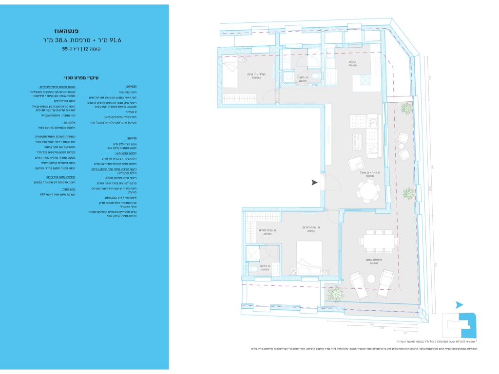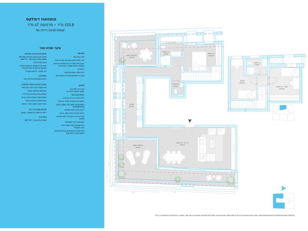 דגם I - פנטהאוז 4 חדרים - 10,700,000 ממוקם בקומה ה- 12+11 - 135.8 מ"ר + 47.8 מ"ר מרפסת - כיוון מזרח/דרום/מערב
